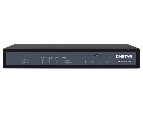 Dinstar DAG1000-8O is a cost-effective IP telephony gateway designed to connect legacy telephones and PBX systems with modern VoIP networks at best price for SMBs, call centers, and branch offices. This analog VoIP gateway features 8 FXO ports, enabling seamless SIP trunk integration, flexible call routing, and number manipulation. With T.38 fax support, multiple codec compatibility, and TR069 remote management, the DAG1000-8O analog VoIP gateway ensures reliable voice transmission, secure communications, and simplified VoIP deployment.