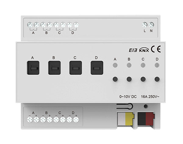 Akubela KXAC-B1DV4 Dimmer Module is a premium 4 Gang 0-10V KNX add-on device designed for smart home and building control systems at best price. This Dimmer Module supports switch, relative, and absolute dimming functions along with scene and preset control, stair light function, bus reset, and manual dimming capability. With output status indication and error reporting, it delivers stable and efficient lighting control performance at best price.