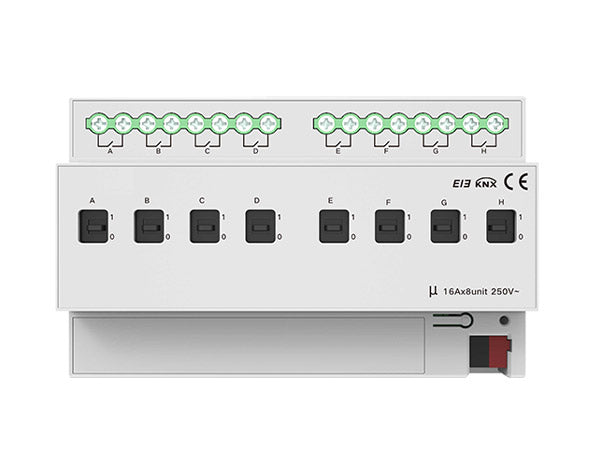 Akubela KXAC-B1R8A16 – Switch Module, 8 Gang 16A KNX Smart Control, 250V-440VAC, Manual & Logic Functions, DIN Rail Design